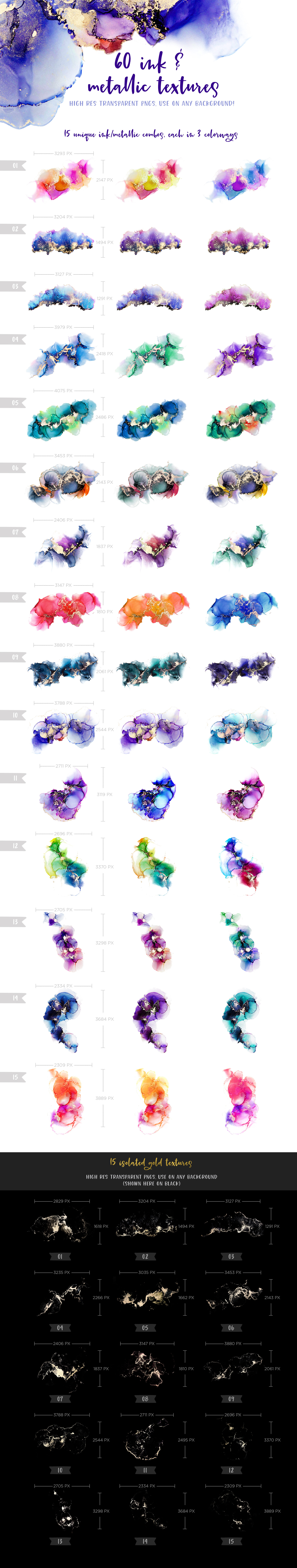 This pack is filled with 15 unique, metallic accented textures, each in 3 colorways for a total of 45 textures! 15 Isolated gold textures are also included to add a punch of shine to any colored or textured background. All ink and gold textures come as high res (300dpi) transparent pngs and are sized at least 2000px on their longest side. This makes them beautiful and crisp on all common print + web applications!