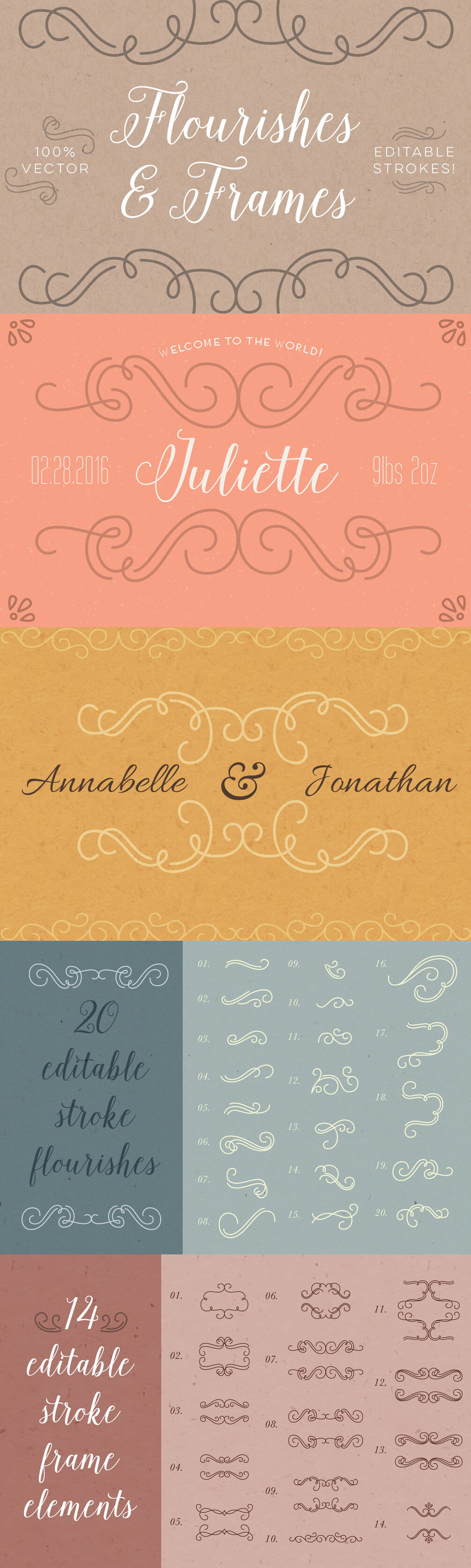 This download includes 20 ai + eps flourishes as live stroke and expanded stroke and 14 ai + eps frame elements as live stroke and expanded stroke for versions of Adobe Illustrator, CS3 or newer. Adjust the stroke weight of any flourish or frame using live stroke versions with the stroke palette in Illustrator. Expanded stroke flourishes and frames are included if you’d like to use them as a shape without needing extra or less weight on each line!