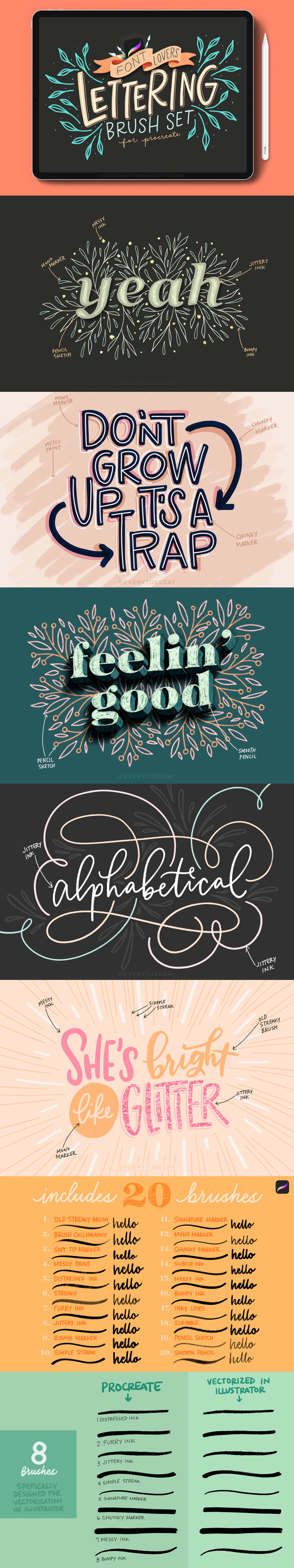 This custom procreate lettering brush set includes 20 unique lettering brushes. 8 of those brushes were specifically designed for vectorization in Adobe Illustrator (check out the preview image above to see em in action!).