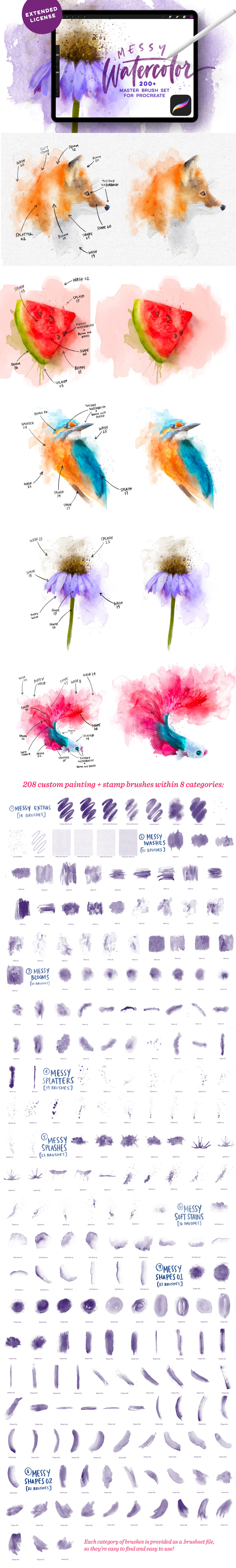 - In the Messy Extras (14 brushes) category, you'll find dynamic watercolor painting brushes, paint splatter scatter brushes, blending brushes and 4 watercolor paper pattern brushes.