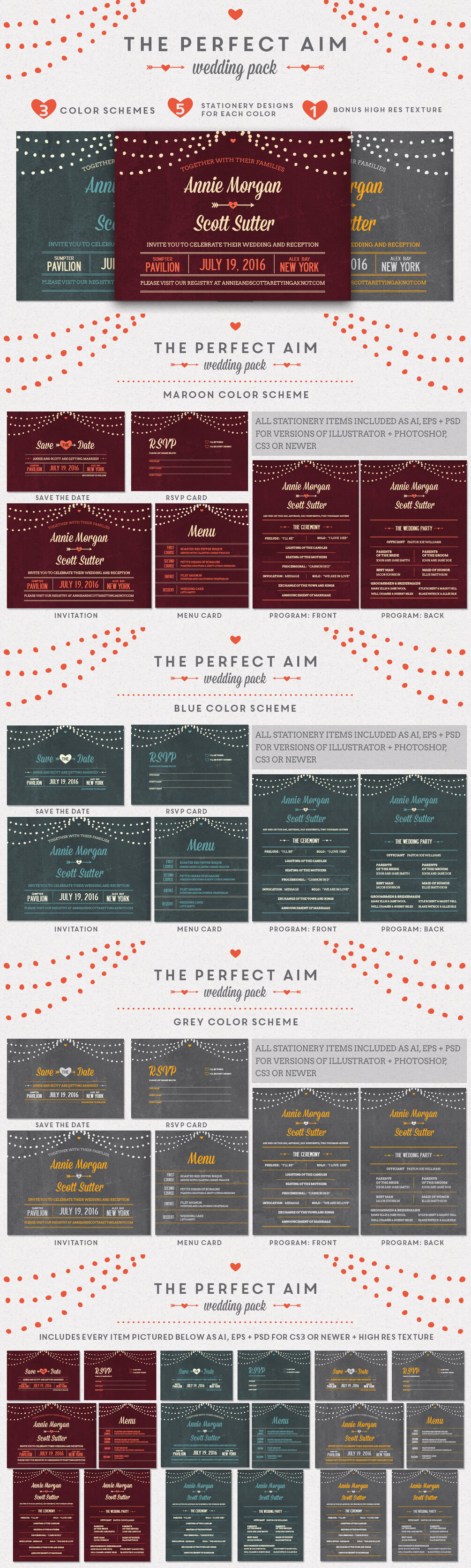 The Perfect Aim Wedding Pack includes a 5 piece wedding kit (Save the Date, Invitation, RSVP, Menu card, and Program with a front + back) in 3 different colors: blue, grey and maroon. Every file in every color scheme is included as an ai, eps, and psd file for versions of Illustrator and Photoshop, CS3 or newer. All files are print ready at 300dpi CMYK and include 1/8" bleeds on all sides. The final print sizes for each item are as follows: