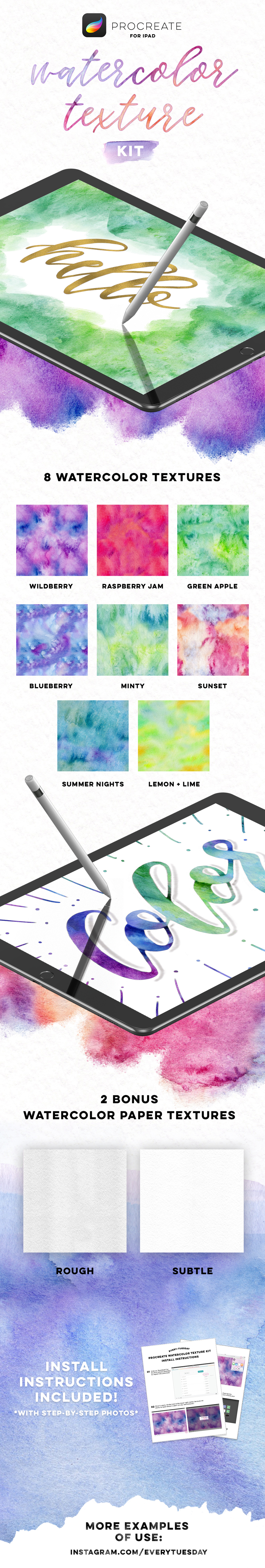 Please note: These are *not* custom Procreate brushes; these are watercolor textures (delivered as jpgs) that can be used with any Procreate brush (or just as backgrounds) with your creations. Check out my instagram: http://instagram.com/everytuesday for video walk throughs of how I use textures with my own lettering!